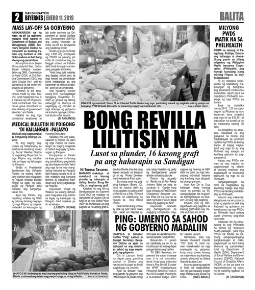 Marcelito Pomoy at non-showbiz girlfriend ikinasal na. - Libo-libong residente inilikas dahil sa matinding baha dahil sa Bagyong AuringPH baha at landslides naitala sa Agusan Del Norte - Bagyong Auring nagbabadyang mag-landfall ngayong araw - Tatlong lalaki nagsuntukan dahil sa away sa videoke 3 patay 2 kritikal at 4 sugatan nang bumangga sa poste. Sinabi kahapon ni Senador Juan Edgardo Sonny Angara na tinatayang 15 milyong government workers ang inaasahang makatatanggap ng mas malaking bonus simula ngayong araw.